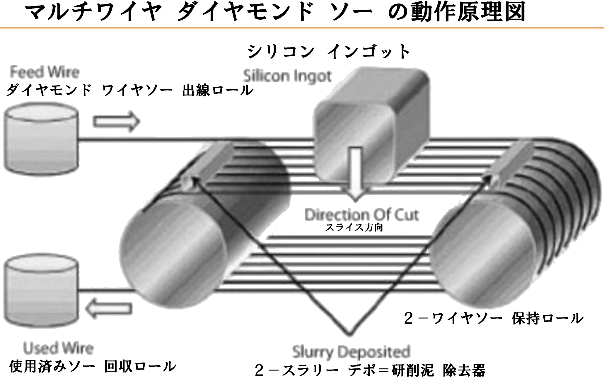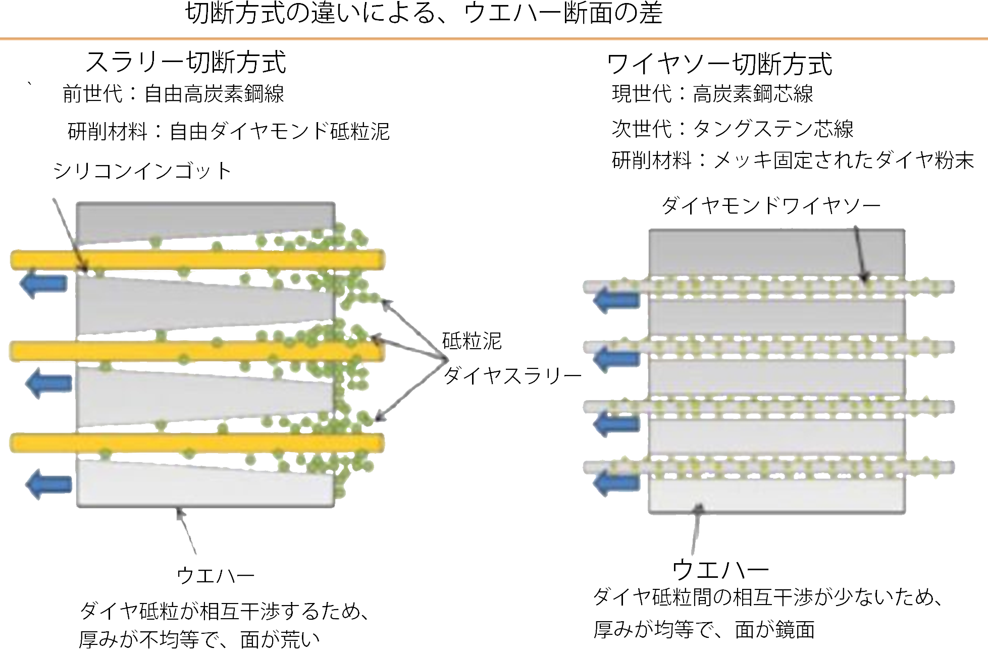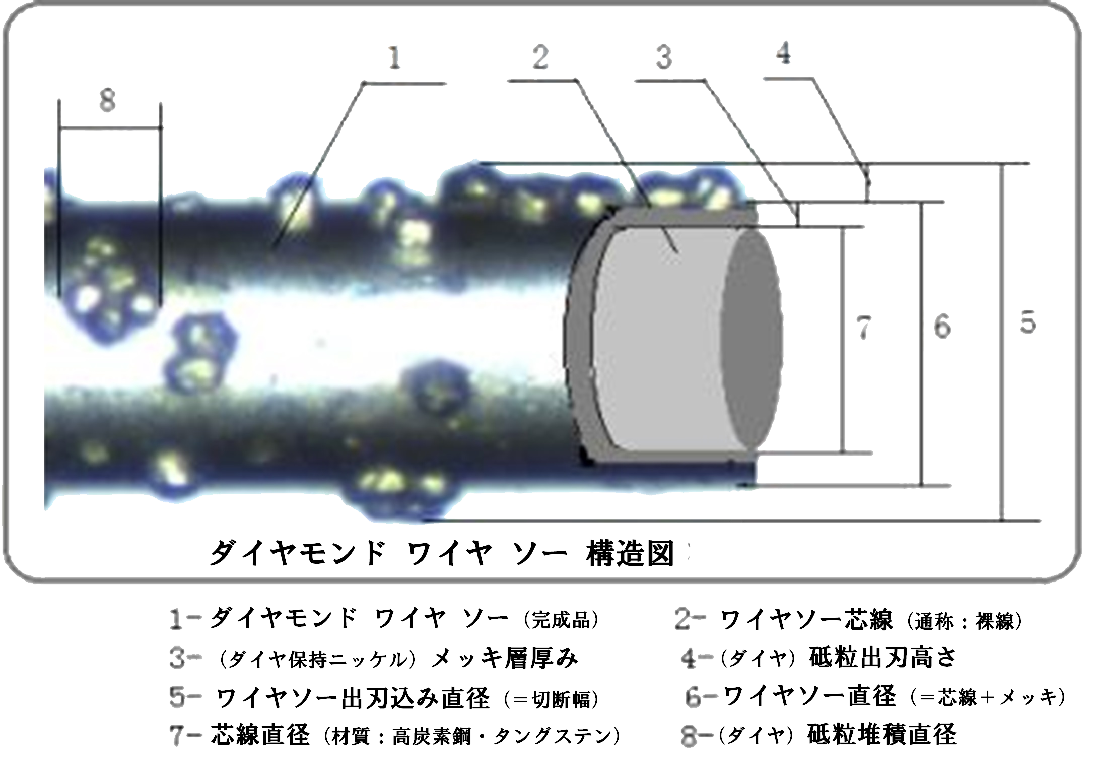説明)◎ 芯線径:高炭素鋼ワイヤソーの線径は約35μm5Nが限界ですが、Wワイヤソーの線径はもっと細くても断線率は低いのでW25でも可用です